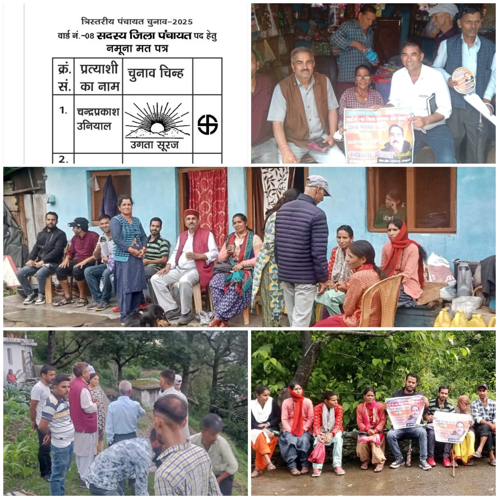 Uttarkashi,, उत्तराखंड में छोटी सरकार चुनने के लिए पंचायत चुनाव चल रहे हैं। जिसको लेकर कई प्रत्याशी मैदान में हैं। प्रत्याशी वोटरों को लुभाने के लिए मतदाताओं के घरों में सुबह से शाम तक डेरे डाले हैं। जनपद के जेमर वार्ड 8 से गुरु जी चंद्र प्रकाश उनियाल अपने प्रतिद्वंदियों को दे रहे हैं कड़ी टक्कर।