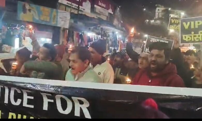 बुधवार को विधायक संजय डोभाल के आव्हान पर कार्यकर्ताओं ने उनके निजी आवास इंद्र पेलेस होटल में इकट्ठा हुए। उसके बाद नगर पालिका के मुख्य सड़क पर कैंडल मार्च निकाल जस्टिक फॉर अंकिता के बैनर तले प्रदर्शन किया। कैंडल मार्च इंद्र पैलेस से होते नगर के मुख्य चौराह से बस स्टैंड तक निकला। इस दौरान सभी ने भाजपा सरकार के खिलाफ नारेबाजी कर दोषियों को कड़ी से कड़ी सजा दिलाने के लिए प्रदर्शन किया। इस दौरान प्रमुख प्रतिनिधि अजवीन पंवार, रविन्द्र रावत, शिव प्रसाद, अजय सिंह, मुकेश राणा, आनंद रावत, सुरेश असवाल सहित सैकड़ों लोग रहे।