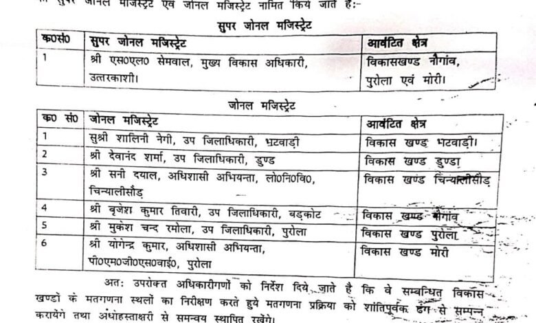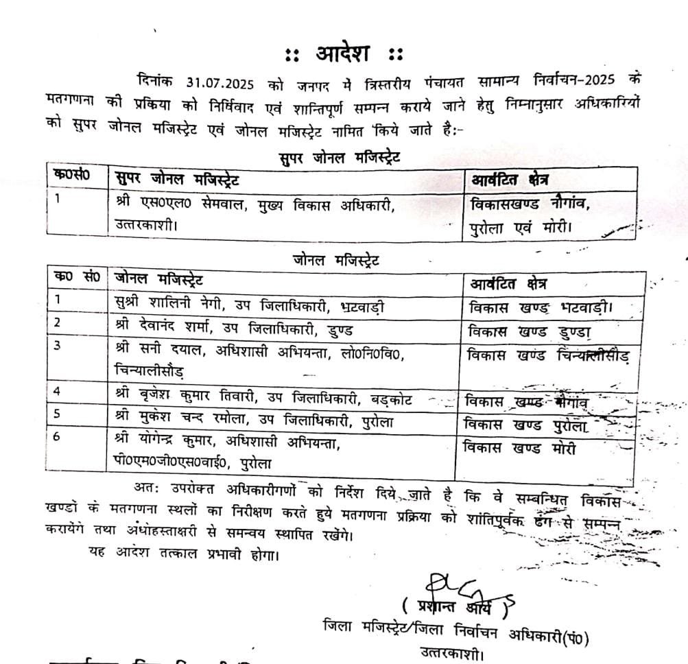 Uttarkashi,, डीएम/जिला निर्वाचन अधिकारी प्रशांत आर्य ने गुरुवार को ” त्रिस्तरीय पंचायत सामान्य निर्वाचन-2025” के मतगणना की प्रकिया को निर्विवाद एवं शांति सम्पन्न कराने के लिए सुपर जोनल मजिस्ट्रेट एवं जोनल मजिस्ट्रेट नामित किए है। जिसमें सीडीओ SL सेमवाल को यमुनाघाटी के (नौगांव,पुरोला व मोरी) का सुपर जोनल मजिस्ट्रेट बनाया गया है। वहीं जोनल मजिस्ट्रेट भटवाड़ी SDM शालिनी नेगी, डुंडा देवानंद शर्मा, सनी दयाल चिन्यालीसौड़, बृजेश तिवारी नौगांव, मुकेश चंद रमोला पुरोला, और योगेन्द्र कुमार को मोरी बनाया गया है।